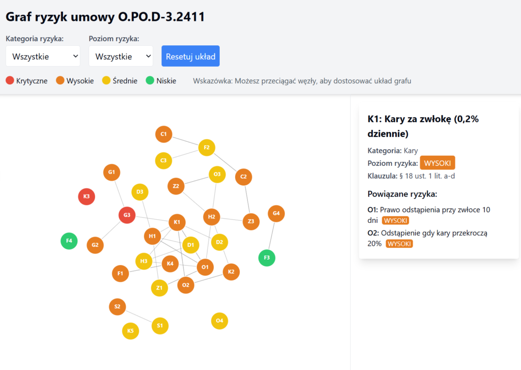 Ryzyka kontraktowe nie są osobnymi bytami. To sieć wzajemnie powiązanych okoliczności, które bezpośrednio rzutują na cenę (lub koszt!) realizacji robót. Przedstawiam wizualizację automatycznej analizy ryzyk kontraktowych wykonaną tym razem niedużym i oszczędnym modelem Gemini-2.0 flash. Koszt analizy 16 centów(!) na umowie od GDDKiA (link do automatycznej analizy w komentarzu). Oczywiście nie zalecałbym stosowania tak małego modelu do specjalistycznej analizy, choć sam efekt oceniam jako bardzo ciekawy, bo oznacza, że koszt fachowej wiedzy spada dramatycznie.